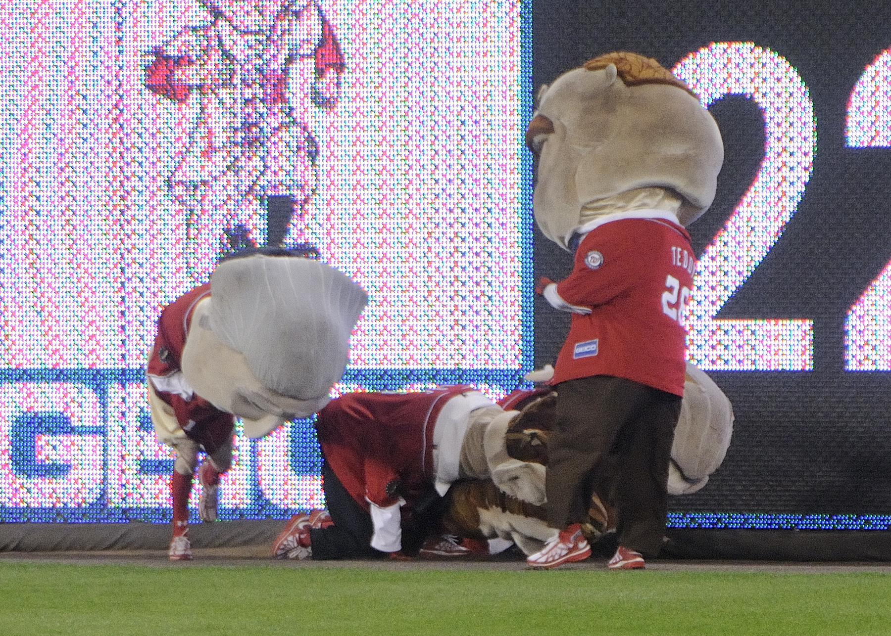 Such was the case Saturday night at Nationals Park, when Teddy Roosevelt, still searching for win #1 in the Nationals’ presidents race, turned on the competition, trapping them in a pack against the outfield scoreboard and slamming them to the ground.