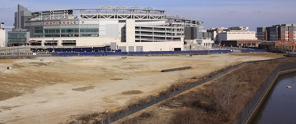 Outside the First Base gate, the long-envisioned river views from Nationals Park are finally beginning to take shape, as the Florida Rock cement factory that stood between the stadium and the river has finally been demolished.
