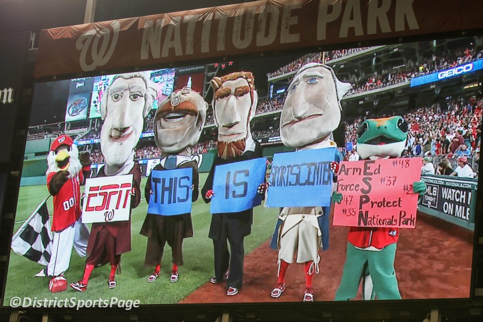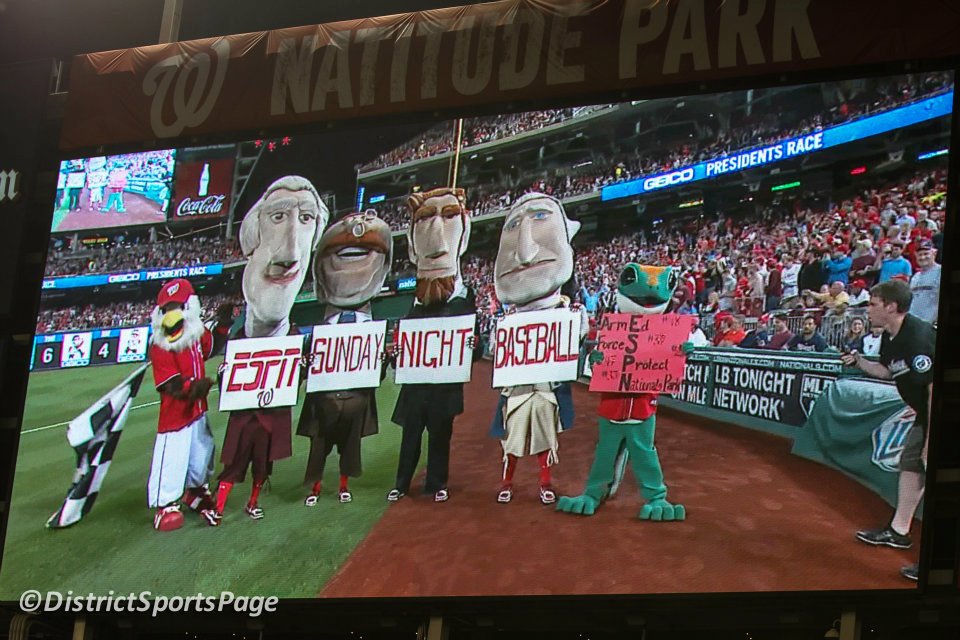 The ESPN crew, which hadn’t been back to Nationals Park since the stadium opened, certainly was ready for the moment, featuring the racing presidents in the Baseball Tonight pregame show, and at length again during the fifth and ninth innings.