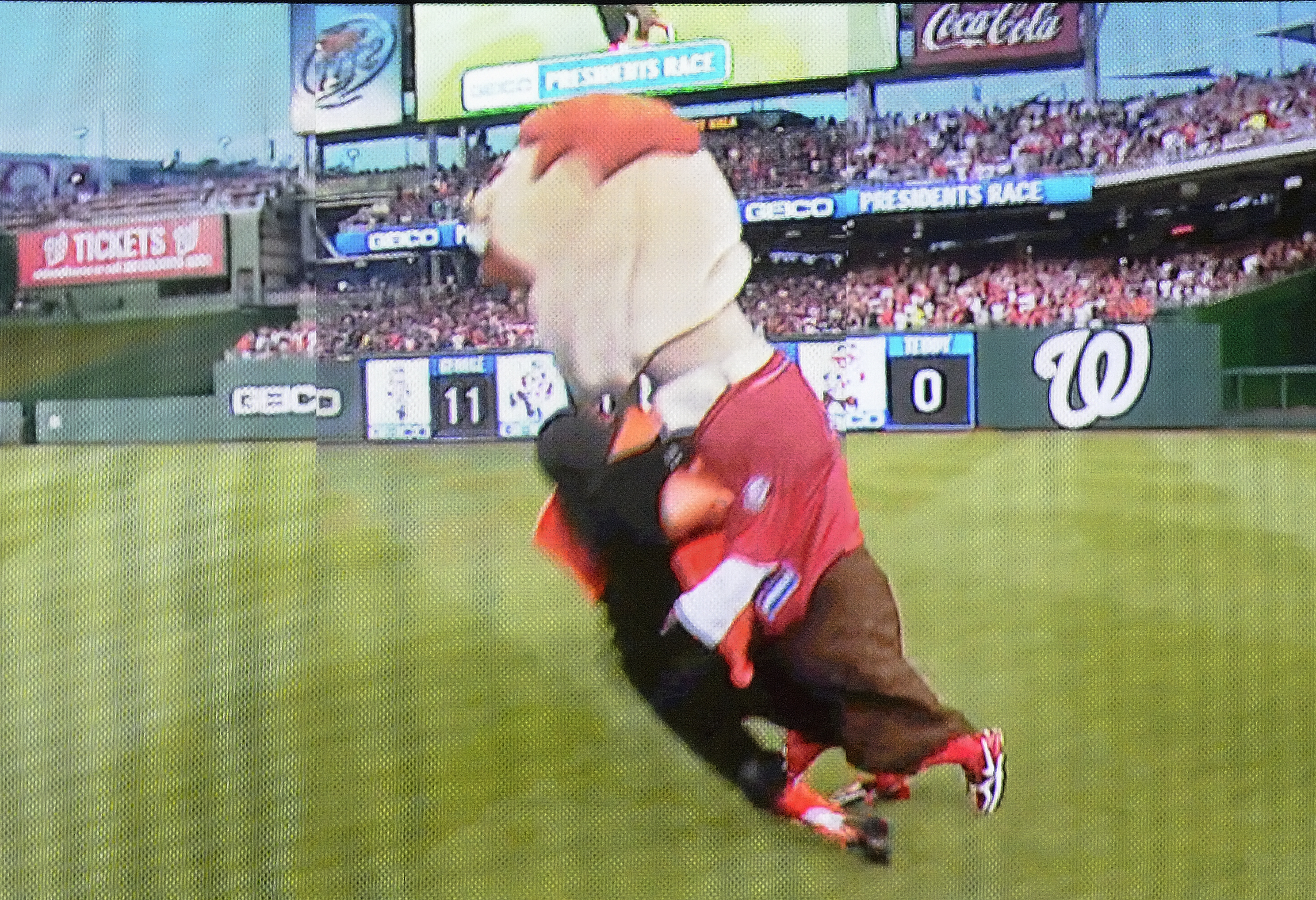 With Teddy rounding the outfield corner carrying a big lead, The Bird appeared on the first base line holding a “Go Teddy” sign.
