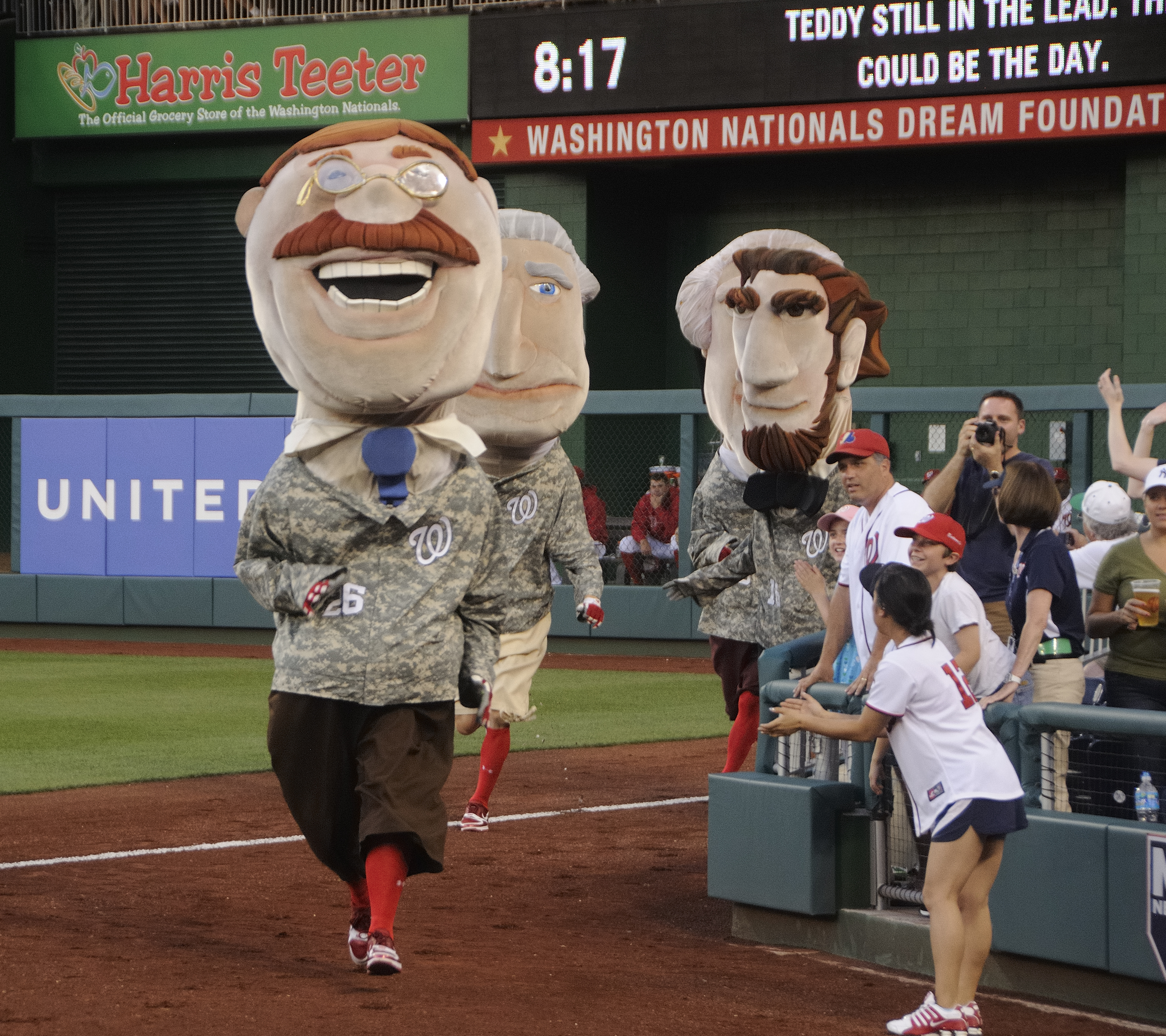 On Friday night, the presidents’ military antics were highlighted during several “Nats HD” features, culminating in the fourth inning race, when the presidents entered the field wearing their new uniforms and riding aboard a U.S Army Humvee in honor of the Army’s 237th anniversary.