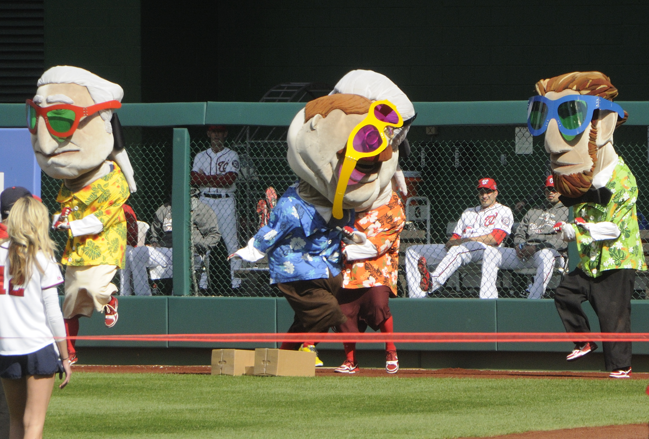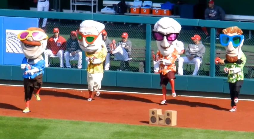 Teddy Roosevelt bolted out wearing sunglasses in the style of Korean dance pop star Psy, and was met in right field by Washington, Jefferson, and Lincoln, wearing similar glasses.