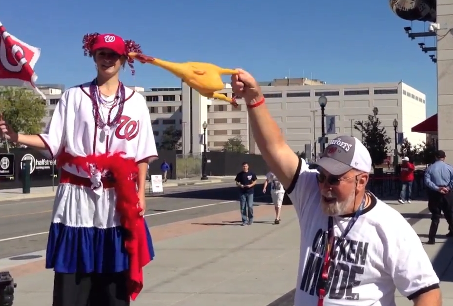 Kaufman, has sacrificed dozens of rubber chickens since 2005 on behalf of his beloved Nationals, attracting the attention of fans and of pitcher Gio Gonzalez, and inspiring Chicken Mode t-shirts. With Gio on the mound Friday to start game 5, expect to see some Chicken Mode on display.