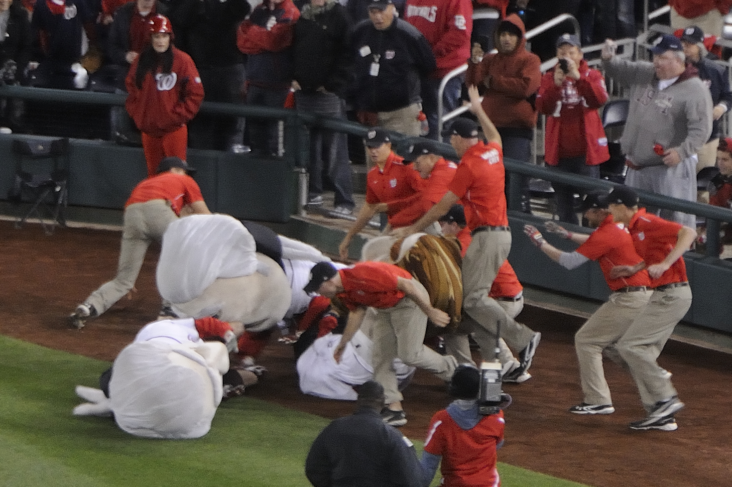 The race carried on with Teddy doubled over on the warning track, but as the other presidents entered the home stretch along the first base line, members of the Nationals grounds crew left their positions and attacked, mercilessly.