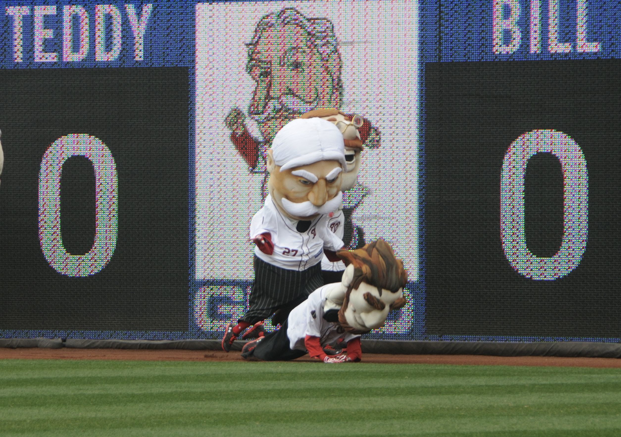 After Jefferson tripped on the fallen Lincoln, Taft chased down Roosevelt, slamming him into the right field wall before both fell to the ground.