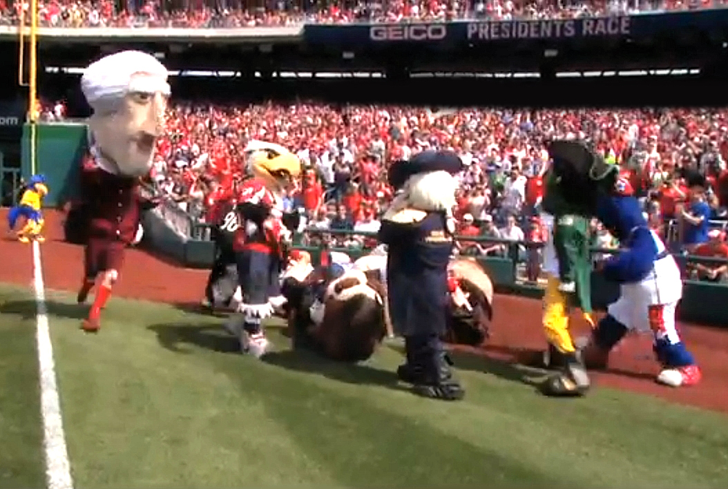 With an army of mascots beating up on Teddy, Bill, Abe, and George, a revived Thomas Jefferson came to his feet and veered around the pile, taking the victory to move himself into a tie atop with George Washington atop the presidents race standings at the end of the homestand.