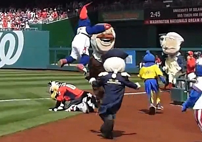 Mascots then streamed from the stands, including George (George Washington University), Uncle Slam (Potomac Nationals), Talon (DC United), The Patriot (George Mason University), and bulldog Jack (Georgetown University), and YoUDee (University of Delaware), all pouncing on the oncoming presidents.