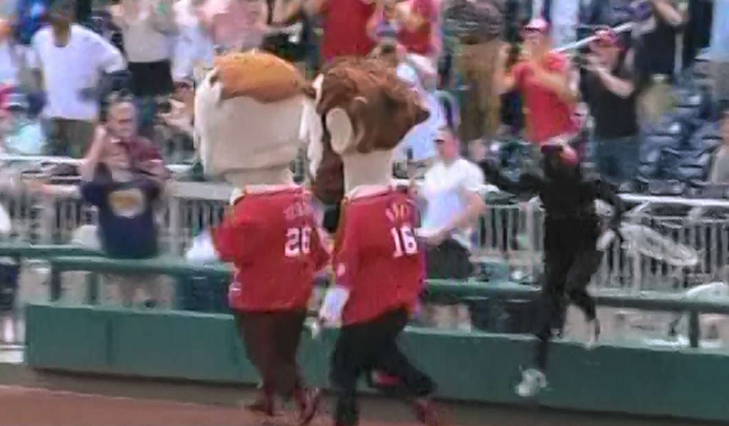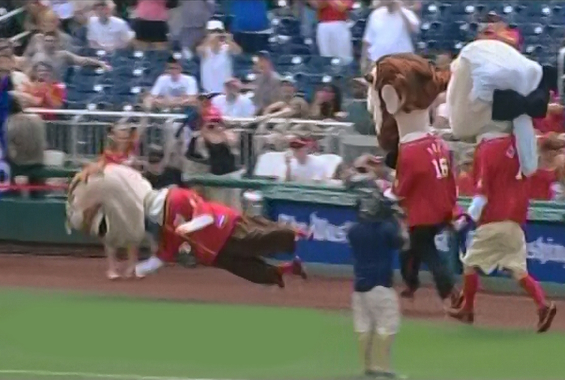 The next day, the Rally Cicada returned to Nationals Park, and appeared ready to ambush Teddy along the finish line. The bug arrived late and missed Teddy completely, yet Teddy pretended to be tripped and fell just short of victory.