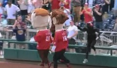 On Saturday, the Rough Rider once again took a big lead into the home stretch, but Abe Lincoln was waiting in ambush, and jumped out of the stands along the third base line, tackling Teddy to the ground, allowing George Washington to race by for the win. On Sunday, George Washington slammed into Teddy with a bicycle.