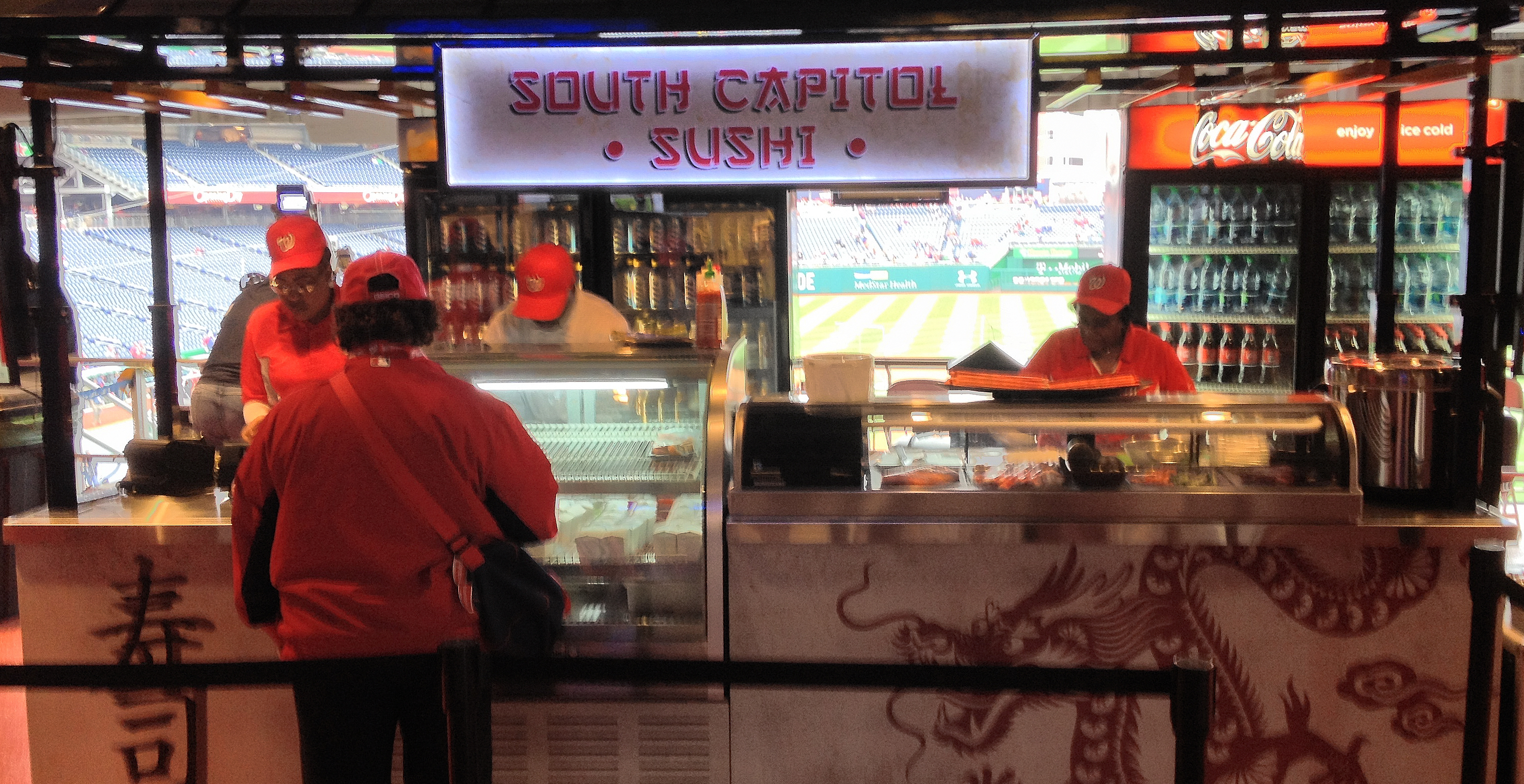 Directly behind the Nationals’ dugout boxes at Section 129 is a new stand called South Capitol Sushi, where maki sushi is rolled to order.