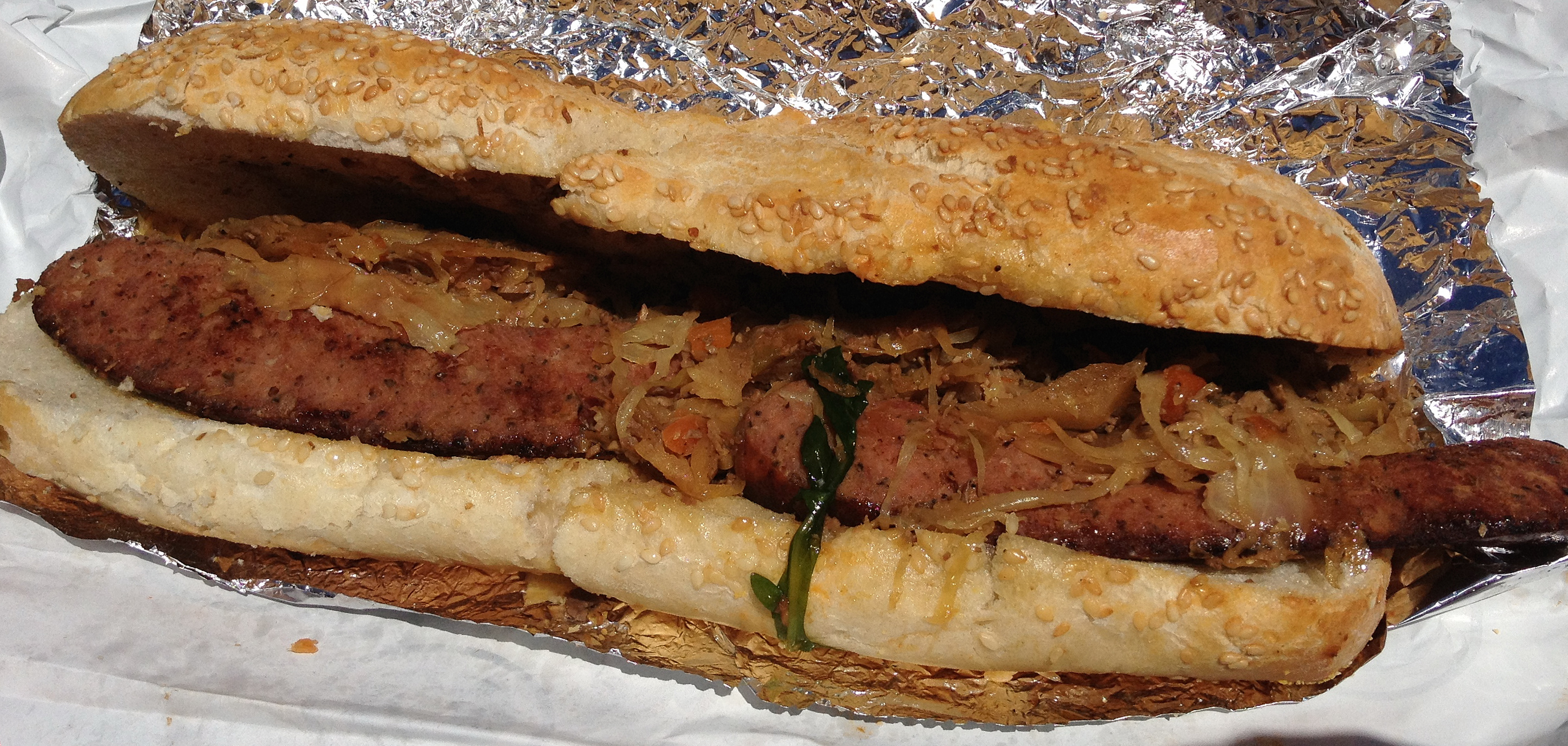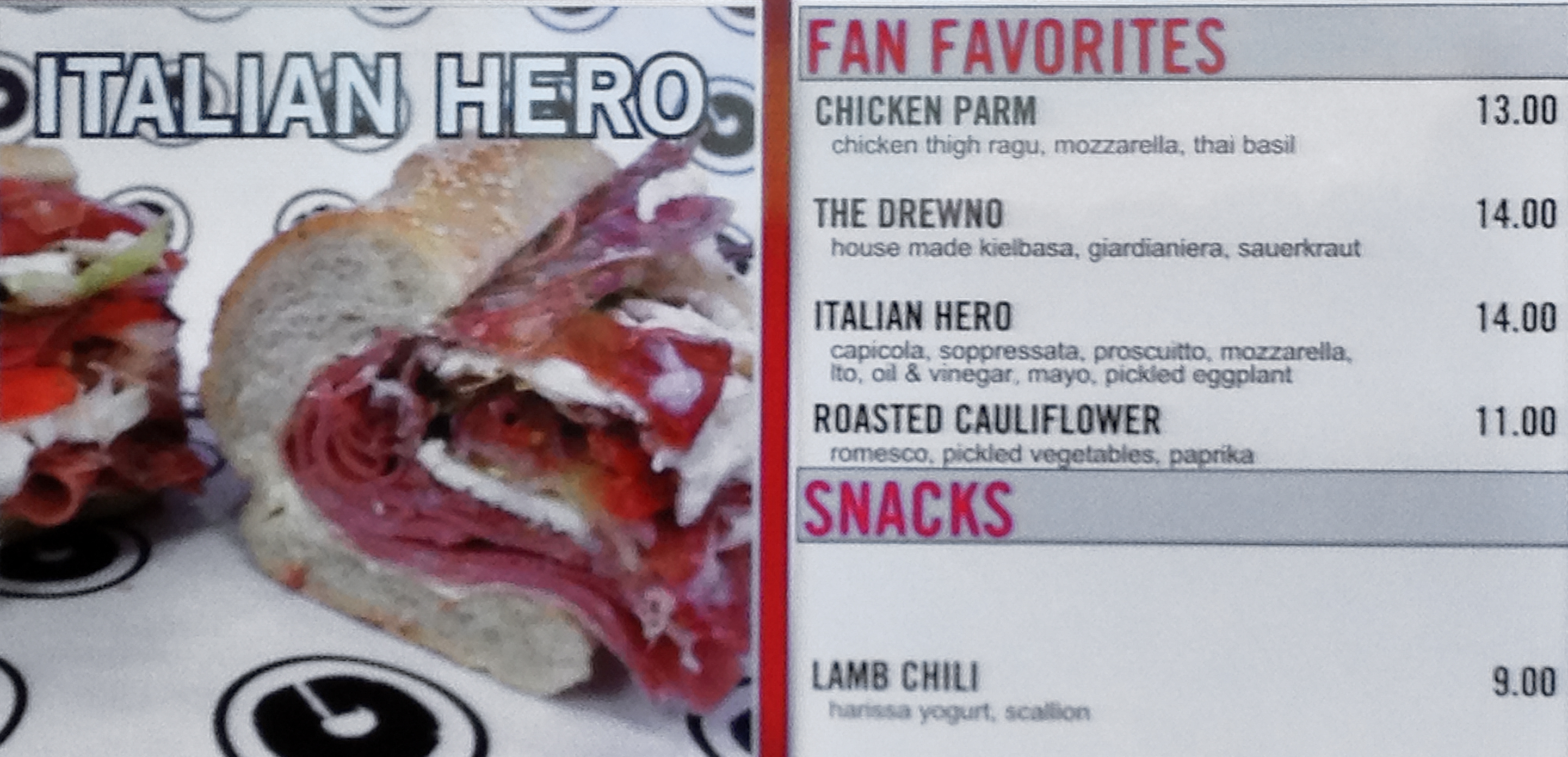 Lines were forming as early as 11:00am at the new Nationals Park outpost of “Top Chef” celebrity Mike Isabella’s G Gourmet Sandwiches behind section 136 along the first base line. The trimmed-down menu features five items from the 14th Street restaurant, including a hot chicken parmesan sub that was drawing raves in the stands, a delicious but very messy hot roasted cauliflower sub with romesco and pickled vegetables (extra napkins required), a cold stuffed Italian hero, and the eponymous “Drewno,” a delicious (if pricey) house-made kielbasa with sauerkraut, named not for the Nat’s reliever, but for Chef Scott Drewno from DC’s The Source.