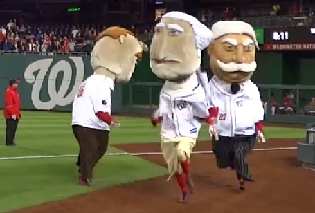 As they approached the home stretch in the fourth inning race, George Washington knocked over Jefferson, and Abe Lincoln stayed behind to finish the job. Teddy turned back to look, and Washington raced by for the win.
