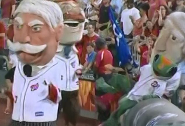 The sponsor, who helps out at the finish line nightly, is usually off limits to the presidents’ antics, but immediately after Tuesday’s race, Thomas Jefferson pushed the amphibian insurance salesman into the Grounds Crew’s tarp in foul territory.
