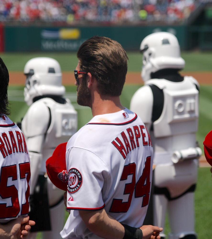 Bryce Harper is surrounded by Stormtroopers during the national anthem: