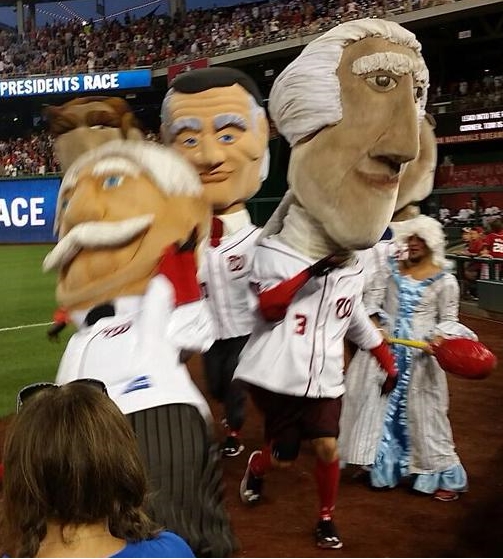 A bearded Martha Washington showed up for the Nats’ presidents race Monday night at Nationals Park and wielded a giant lollipop to knock out her husband’s five foes with one mighty blow.